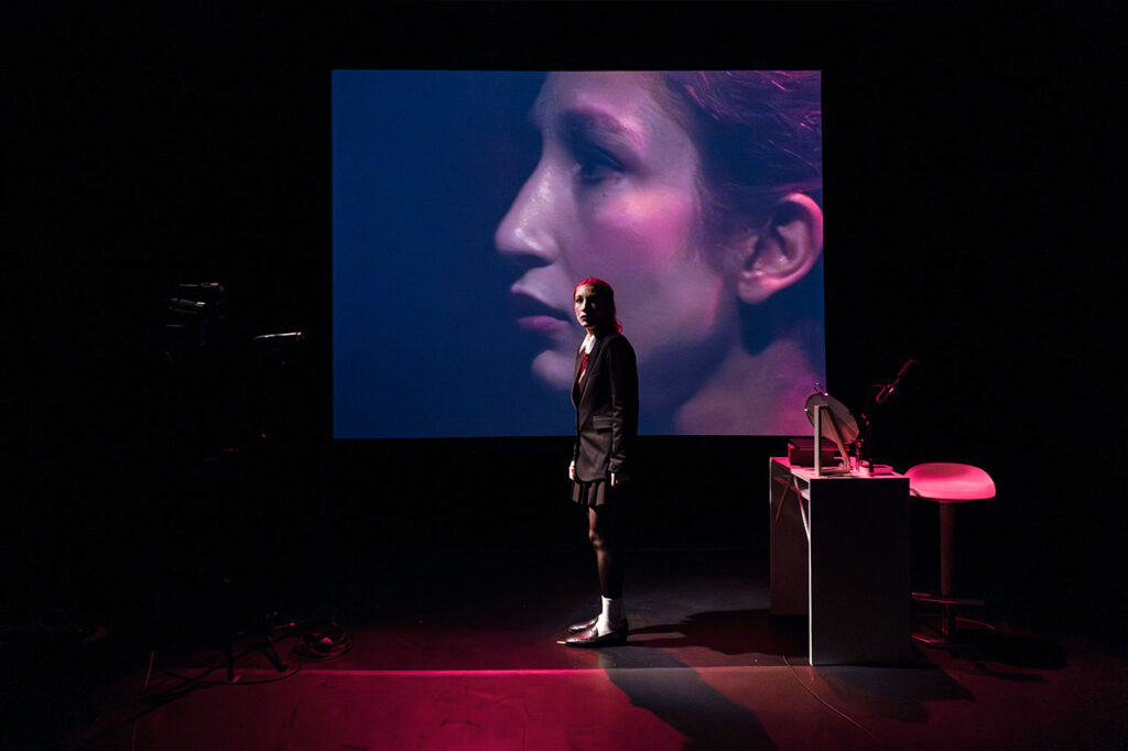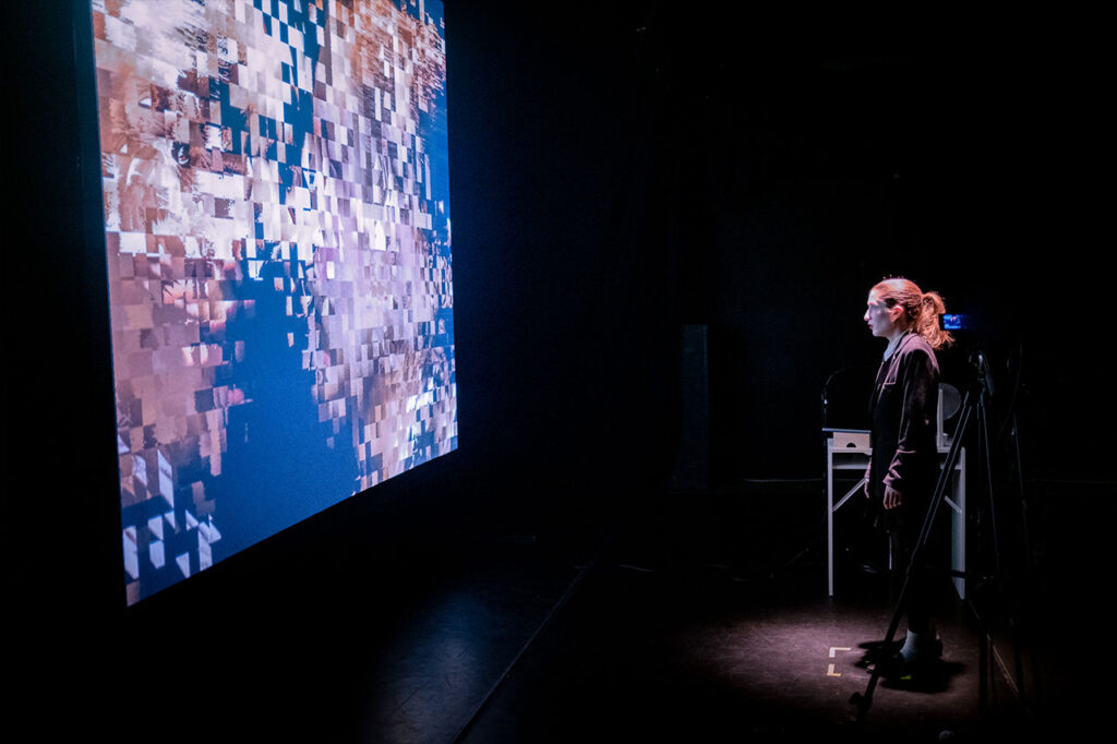 Molly è vista solo di profilo. Guarda una videocamera, anch’essa di profilo. Eppure il risultato è diretto, su schermo, verso il pubblico: uno specchio che viene manipolato in diretta, così tanto da dimenticarsi della presenza dal vivo.